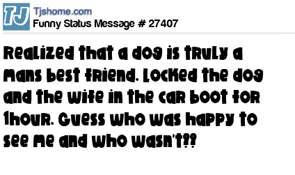 - # 92748 Dogs are truly mans best friend. If you dont believe me, lock your wife/girlfriend and dog in the trunk of your car. After a few hours go back and open it. Which of them is glad to see you?