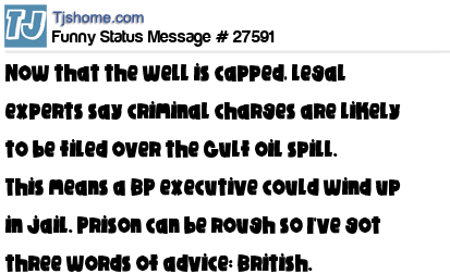 X Now that the well is capped, legal experts say criminal charges are likely to be filed over the Gulf oil spill. This means a BP executive could wind up in jail. Prison can be rough so I've got three words of advice: British. Petroleum. Jelly.