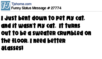 X I just bent down to pet my cat, and it wasn't my cat. It turns out to be a sweater crumbled on the floor. I need better glasses!