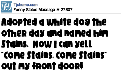 X adopted a white dog the other day and named him Stains. Now I can yell "Come Stains, Come Stains" out my front door!
