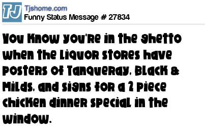 X  You know you're in the ghetto when the liquor stores have posters of Tanqueray, Black & Milds, and signs for a 2 piece chicken dinner special in the window.
