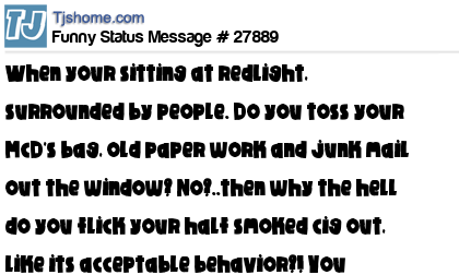 X says when your sitting at redlight, surrounded by people. Do you toss your McD's bag, old paper work and junk mail out the window? No?..then why the hell do you flick your half smoked cig out, like its acceptable behavior?! You jagoffs!!