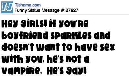 X hey girls! if you're boyfriend sparkles and doesn't want to have sex with you, he's not a vampire. He's gay!