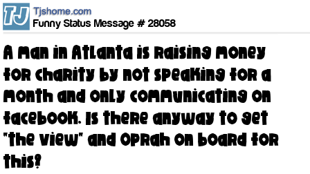 X says A man in Atlanta is raising money for charity by not speaking for a month and only communicating on facebook. Is there anyway to get "the view" and Oprah on board for this?