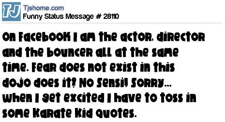 X On Facebook I am the actor, director and the bouncer all at the same time. Fear does not exist in this dojo does it? No Sensi! Sorry... when I get excited I have to toss in some Karate Kid quotes.