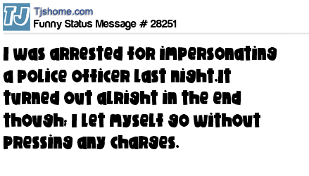 X I was arrested for impersonating a police officer last night.It turned out alright in the end though; I let myself go without pressing any charges.