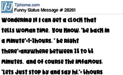 X Wondering If I can get a clock that tells woman time. You know, "be back in a minute"=1-2hours. " be right there"=anywhere between 25 to 45 minutes. and of course the imfamous, "Lets just stop by and say hi."= 6hours plus. And last but not least, "just