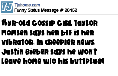 X says 16yr-old Gossip Girl Taylor Momsen says her bff is her vibrator. In creepier news, Justin Bieber says he won't leave home w/o his buttplug!