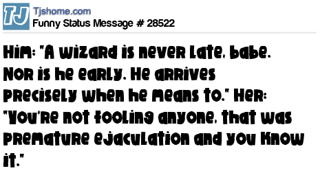 X Him: "A wizard is never late, babe. Nor is he early. He arrives precisely when he means to." Her: "You're not fooling anyone, that was premature ejaculation and you know it."