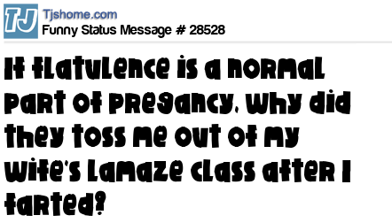 X is If flatulence is a normal part of pregancy, why did they toss me out of my wife's lamaze class after I farted?