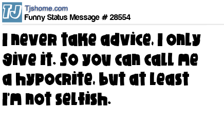X I never take advice, I only give it. So you can call me a hypocrite, but at least I'm not selfish.