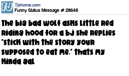 X is the big bad wolf asks little red riding hood for a bj she replies "stick with the story your supposed to eat me." thats my kinda gal
