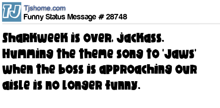 X says Sharkweek is over, jackass. Humming the theme song to 'Jaws' when the boss is approaching our aisle is no longer funny.