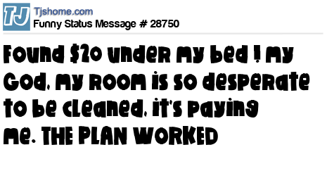 X is found $20 under my bed ! my God, my room is so desperate to be cleaned, it's paying me. THE PLAN WORKED