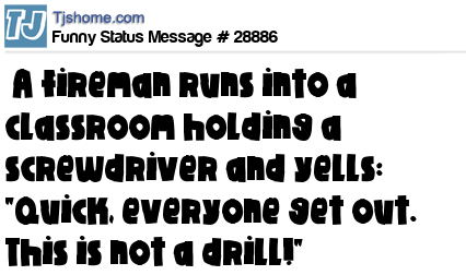 X A fireman runs into a classroom holding a screwdriver and yells: "Quick, everyone get out. This is not a drill!"
