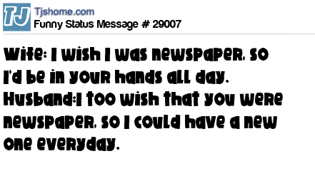 X Wife: I wish I was newspaper, so I'd be in your hands all day. Husband:I too wish that you were newspaper, so I could have a new one everyday.