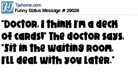X says "Doctor, I think I'm a deck of cards!" The doctor says, "Sit in the waiting room, I'll deal with you later."