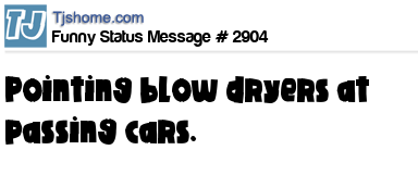 - # 91136 Sometimes when I am bored I like to park on the side of the freeway and stick a blow dryer out the window and watch the cars slam on their brakes.