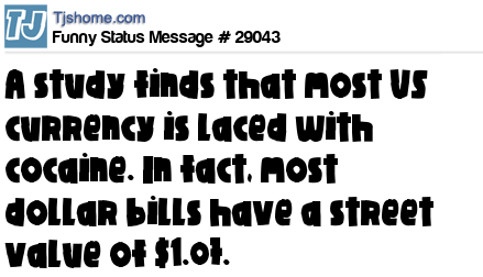X A study finds that most US currency is laced with cocaine. In fact, most dollar bills have a street value of $1.07.