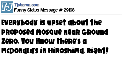 - # 30132 Very opposed to the Ground Zero Mosque but only cuz I think we need a Ground Zero Chick-Fil-A first.