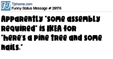 - # 136287 Speaking of IKEA, I think the phrase "Some assembly required" is Swedish for "Here's a pine log and some nails."