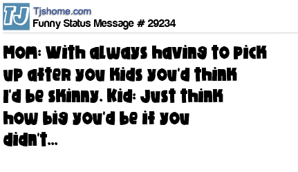 X Mom: With always having to pick up after you kids you'd think I'd be skinny. Kid: Just think how big you'd be if you didn't...