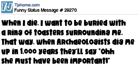 - # 67689 When I die , I want to be buried with a ring of toasters or egg beaters around me . then when they dig me up 1000`s of years from now the archeologists will say "wow we stumbled apon someone of great importance"