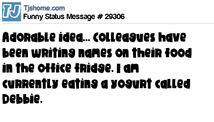 X Adorable idea... Colleagues have been writing names on their food in the office fridge. I am currently eating a yogurt called Debbie.
