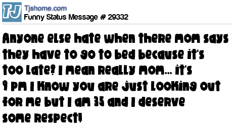 X Anyone else hate when there mom says they have to go to bed because it's too late? I mean really mom... it's 9 pm I know you are just looking out for me but I am 35 and I deserve some respect!