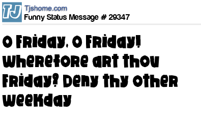 - # 29190 O Friday, O Friday! wherefore art thou Friday? Deny thy other weekdays and refuse thy work hours. Or if thou wilt not, just hurry up and get here already.