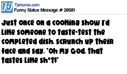 X Just once on a cooking show I'd like someone to taste-test the completed dish, scrunch up their face and say, "Oh my God, that tastes like sh*t!"