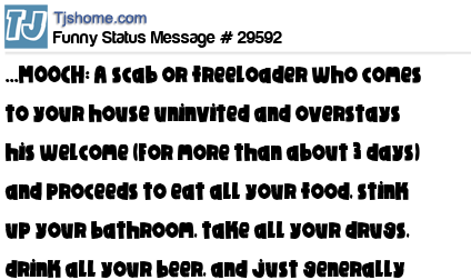 X ...MOOCH: A scab or freeloader who comes to your house uninvited and overstays his welcome (For more than about 3 days) and proceeds to eat all your food, stink up your bathroom, take all your drugs, drink all your beer, and just generally leech all the b