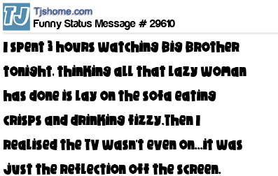 X I spent 3 hours watching Big Brother tonight, thinking all that lazy woman has done is lay on the sofa eating crisps and drinking fizzy.Then I realised the TV wasn't even on...it was just the reflection off the screen.