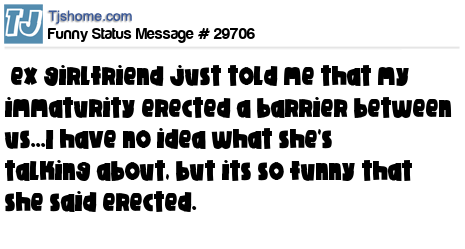 X ex girlfriend just told me that my immaturity erected a barrier between us...I have no idea what she's talking about, but its so funny that she said erected.