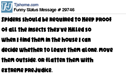 X Spiders should be required to keep proof of all the insects they've killed so when I find them in the house I can decide whether to leave them alone, move them outside, or flatten them with extreme prejudice.