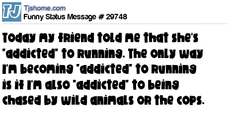 X Today my friend told me that she's "addicted" to running. The only way I'm becoming "addicted" to running is if I'm also "addicted" to being chased by wild animals or the cops.