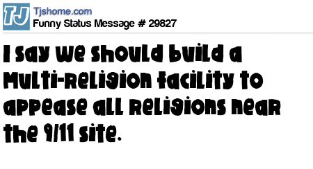 I actually think they should build this thing. It would be entertaining. Christian sneaking into the muslim service trying to convert, muslims sneaking into the christian services trying to convert, Catholics DRUNK OFF THEIR ASSES, Jews in the parking lot scavaging for loose change, the scientologist jumping on couches while watching "Battlefield Earth" on DVD, and the buddhist, peacefully minding their own business. Come on, if you cant find humor in a talking snake, a guy walking on water, and holy cosmic rape inception, you my friend, have no funny bone. Besides, building the thing? eh, its like 5 blocks away from the site. Have you even been to ground zero? 5 blocks in new york is BIG. Its no where near the site. I'll tell you whats near the site though, a gentlemens club. That place is f*cking expensive too. 60 bucks a lap dance. What a rip off.