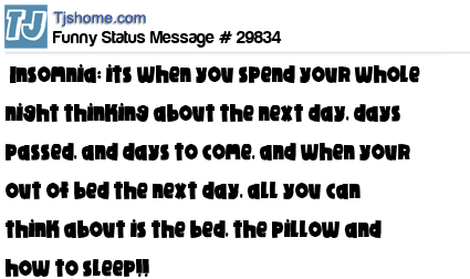 X says Insomnia: its when you spend your whole night thinking about the next day, days passed, and days to come, and when your out of bed the next day, all you can think about is the bed, the pillow and how to sleep!!