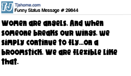 X says Women are angels. And when someone breaks our wings, we simply continue to fly...on a broomstick. We are flexible like that.