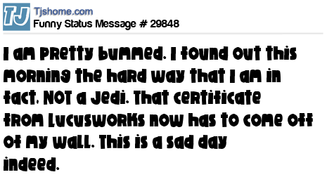 X I am pretty bummed. I found out this morning the hard way that I am in fact, NOT a Jedi. That certificate from Lucusworks now has to come off of my wall. This is a sad day indeed.
