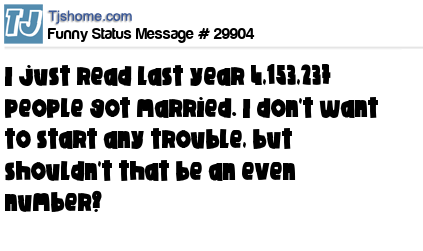- # 36243 I just read that 4,153,237 people got married last year, I don't want to start any trouble, but shouldn't that be an even number?
