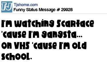 - # 84013 I'm watching Scarface because I'm gangsta. On VHS because I'm old school. At Wal-Mart because I'm homeless.