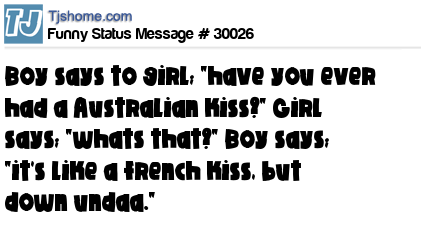 - # 76141 Girl:i"d French kiss you. Guy: I'd Australian kiss you Girl: What's that? Guy: A french kiss only down under ;)