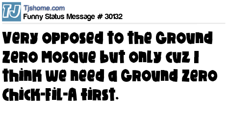 X Very opposed to the Ground Zero Mosque but only cuz I think we need a Ground Zero Chick-Fil-A first.