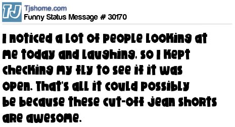 X I noticed a lot of people looking at me today and laughing, so I kept checking my fly to see if it was open. That's all it could possibly be because these cut-off jean shorts are awesome.
