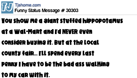 X You show me a giant stuffed hippopotamus at a Wal-Mart and I'd NEVER even consider buying it. But at the local county fair... I'll spend every last penny I have to be the bad ass walking to my car with it.