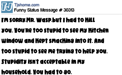 X I'm sorry,Mr. Wasp,but I had to kill you. You're too stupid to see my kitchen window and kept smacking into it. And too stupid to see me trying to help you. Stupidity isn't acceptable in my household. You had to go.