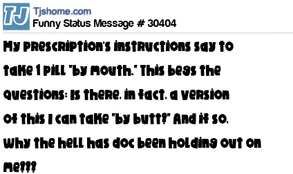 X My prescription's instructions say to take 1 pill "by mouth." This begs the questions: Is there, in fact, a version of this I can take "by butt?" And if so, why the hell has doc been holding out on me???