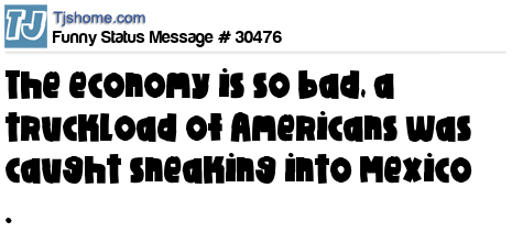 - # 56739 The recession is so bad, just today I saw a polygamist with only one wife, got a pre-declined credit card in the mail, and watched a truckload of Americans sneaking across the border into Mexico.