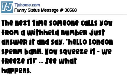 X The next time someone calls you from a withheld number just answer it and say, "hello London sperm bank. You squeeze it - we freeze it!" ... See what happens.